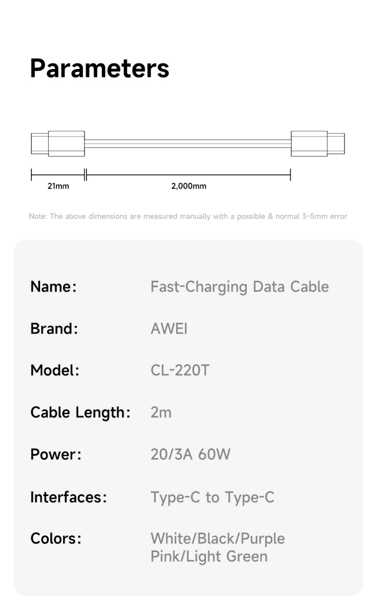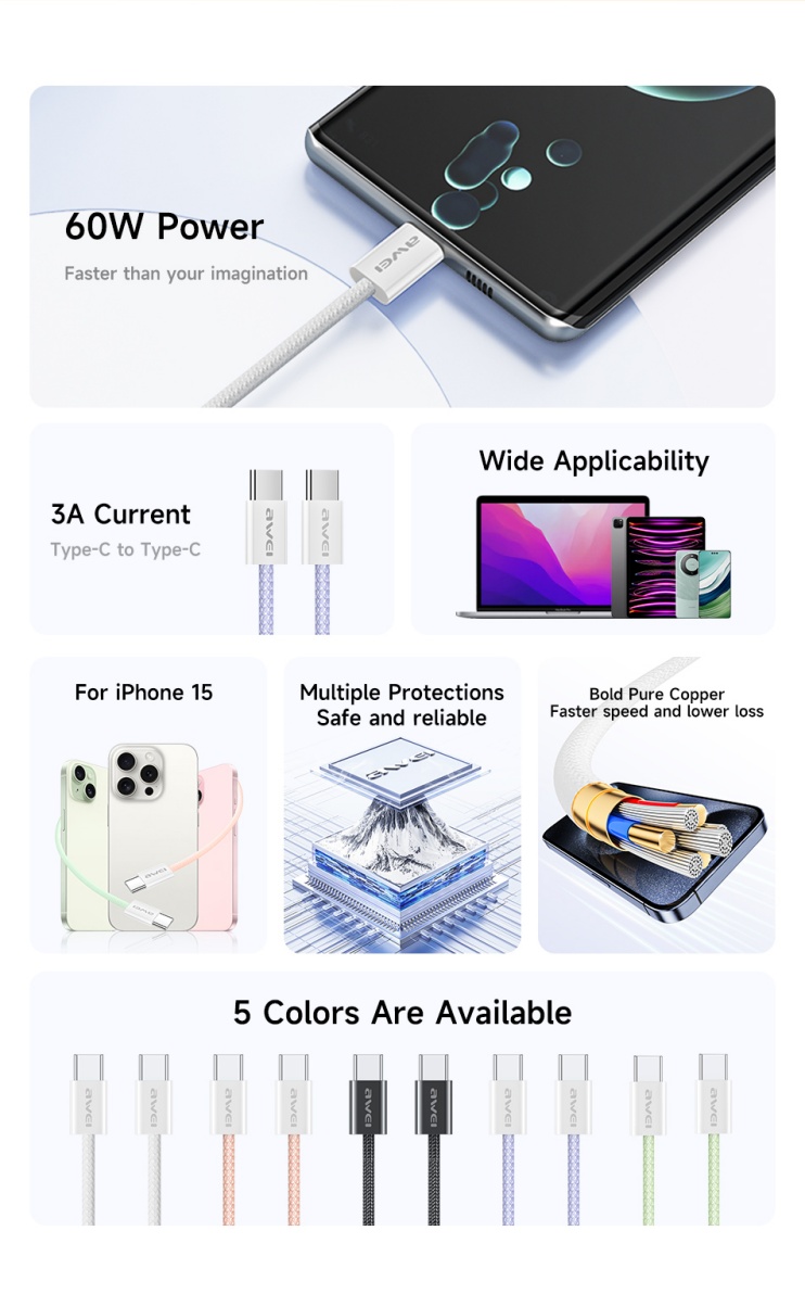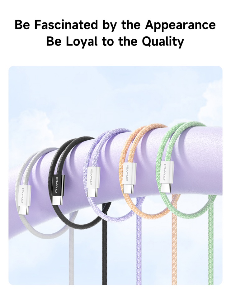 AWEI TYPE-C To TYPE-C Braided Rope 60W Fast Charging Cable 2m